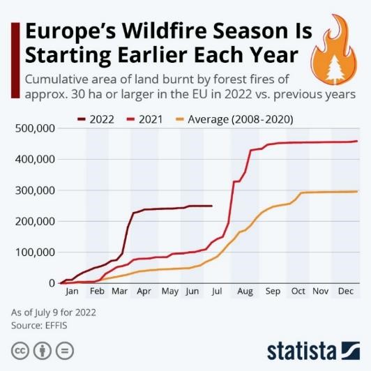 Mevsim normallerinin üstündeki bu sıcaklık artışları, toprağın da kuruması ve artık nemini bırakması ile büyük orman yangınlarına kapı aralıyor. EFFIS’in (European Forest Fire Information System) raporuna göre daha en kötüsü bile görülmedi. 2008-2020 ortalamaları baz alınarak yapılan istatistiğe göre ortalamaların üstünde seyreden yangınlar, önümüzdeki Eylül ayına kadar da hızla artacak diye tahmin ediliyor.