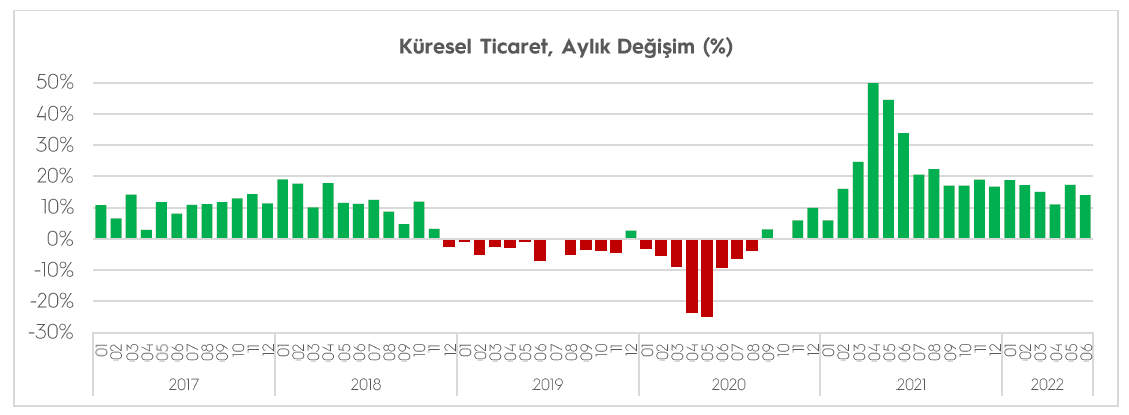 2022 yılı Haziran ayında gerçekleşen küresel ticaret bir önceki senenin aynı ayına göre %17,0 artışla 2,16 trilyon oldu.