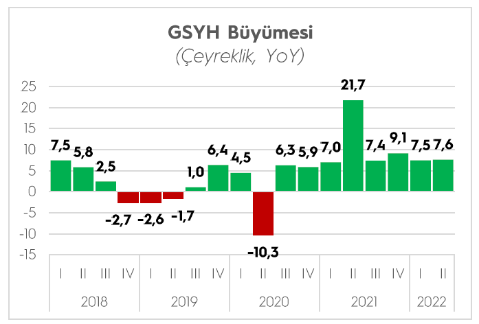 TÜİK tarafından yayımlanan verilere göre Türkiye Ekonomisi ise 2022 yılının ikinci çeyreğinde yüzde 7,6 büyüyerek, 8 çeyrek art arda büyüme kaydetti.