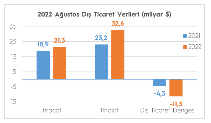 Türkiye’nin Ağustos ayı dış ticaret verilerine bakıldığında ise ihracatın geçtiğimiz yılın aynı ayına göre %13,1 artışla 21,3 milyar dolar, ithalatın ise %40,8 artışla 32,6 milyar dolar olarak gerçekleştiği görüldü.
