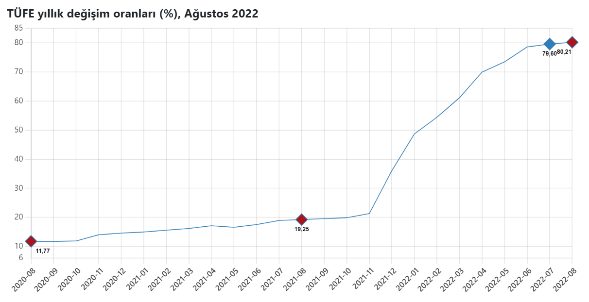 Hanehalkını en çok ilgilendiren rakam ise tabii ki Enflasyon oldu. Ağustos 2022 enflasyonu Tüketici Fiyat Endeksine göre bir önceki aya göre %1,46 ve bir önceki yılın aynı ayına göre ise %80,21’lik bir değişim gösterdi.