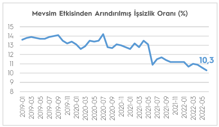 2022 Haziran ayında işsiz sayısı, bir önceki aya göre 136 bin kişi azalarak, 3 milyon 541 bin oldu. İşsizlik oranı %0,3 puanlık azalış ile %10,3 oldu.
