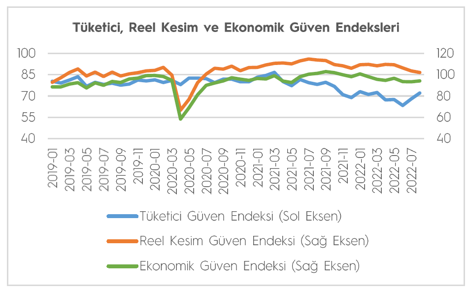 2022 yılı Ağustos ayında Reel Kesim Güven Endeksi (RKGE) bir önceki aya göre 1,6 puan azalarak 102,1 seviyesinde gerçekleşti. Ekonomik Güven Endeksi ise %1,0 artarak 94,3 olarak gerçekleşti. Tüketici Güven Endeksi ise Ağustos ayında bir önceki aya göre %6,1 artarak 72,2 oldu.