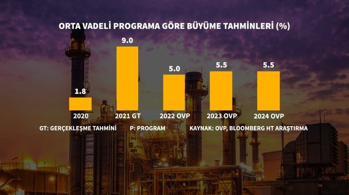 Programda 2022 yılına ilişkin büyüme yüzde 5 olarak belirlenirken, 2023 ve 2024 için de yüzde 5,5’lik büyüme hedefi kondu. Bu yıla ilişkin büyümede gerçekleşme tahmini yüzde 9 oldu.