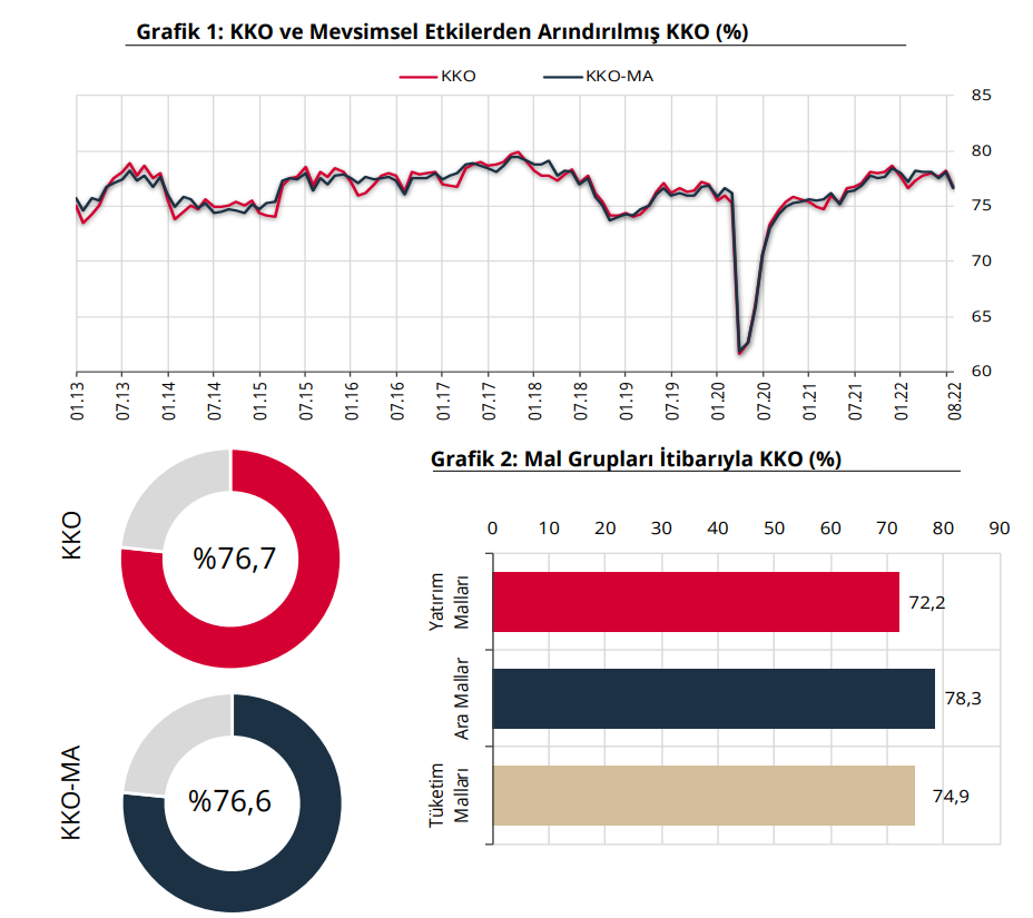 Mevsimsel etkilerden arındırılmış kapasite kullanım oranı (KKO-MA), bir önceki aya göre 1,5 puan azalarak yüzde 76,6 seviyesinde gerçekleşti.