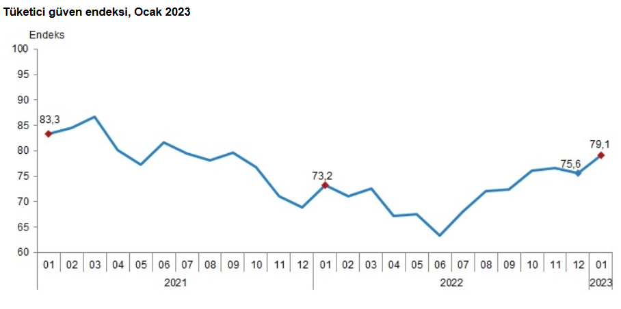 Türkiye İstatistik Kurumu ve Türkiye Cumhuriyet Merkez Bankası iş birliği ile yürütülen tüketici eğilim anketi sonuçlarından hesaplanan tüketici güven endeksi, Ocak ayında bir önceki aya göre %4,6 oranında arttı; Aralık ayında 75,6 olan endeks, Ocak ayında 79,1 oldu. Tüketici güveninde Haziran ayından başlayan artış Aralık ayındaki düşüşüne rağmen Ocak ayında da devam ediyor.
