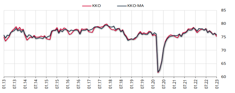 2023 yılı Ocak ayında, imalat sanayinde faaliyet gösteren 1751 iş yeri tarafından İktisadi Yönelim Anketi’ne verilen yanıtlar toplulaştırılarak elde edilen mevsimsel etkilerden arındırılmış Kapasite Kullanım Oranı (KKO-MA), bir önceki aya göre 0,6 puan azalarak yüzde 75,8 seviyesinde gerçekleşti. Mevsimsel etkilerden arındırılmamış Kapasite Kullanım Oranı (KKO), bir önceki aya göre 1,2 puan azalarak yüzde 75,3 seviyesinde gerçekleşti.
