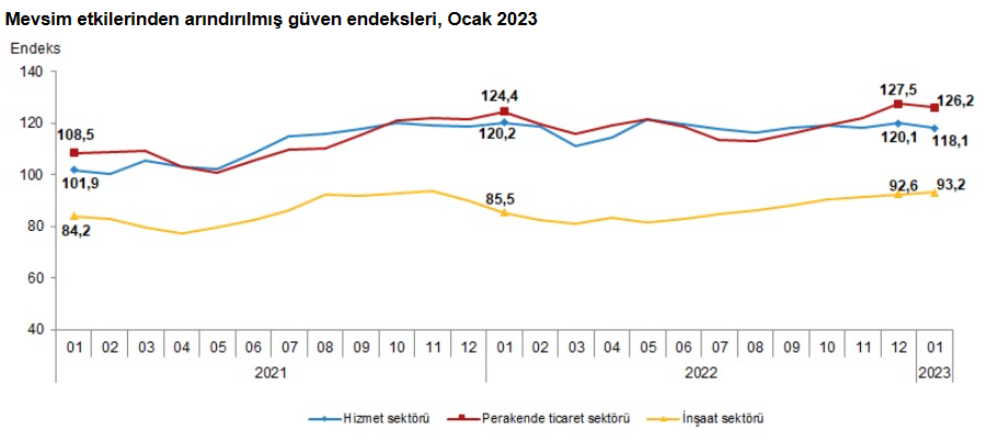 Kaynak: TÜİK, Hizmet, Perakende Ticaret ve İnşaat Güven Endeksleri, Ocak 2023