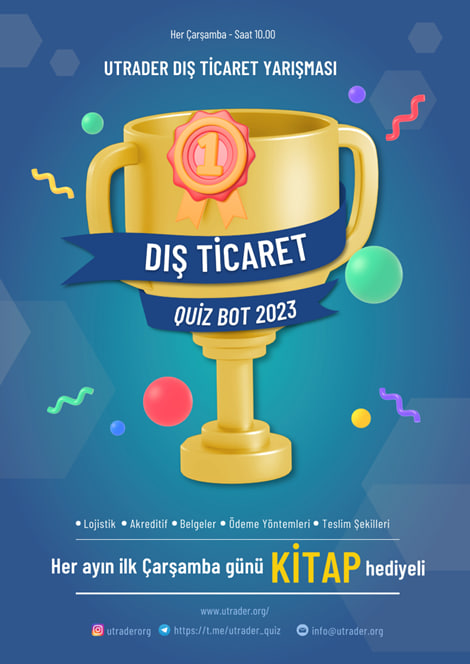 Her hafta Çarşamba günü Telegram kanalımızda yapılan Q-Bot Dış Ticaret yarışmalarımız devam ediyor. Toplam 59 haftadır 600+ üzerinde yarışmacının katıldığı Türkiye’deki tek Dış Ticaret Yarışmasına sizi de bekliyoruz. 1 Şubat’taki yarışmamız imzalı KİTAP hediyeli olacak. Paylaşılacak kitabımıza e-bültenimizin KİTAPLARLA HATIRLANANLAR bölümünden ulaşabilirsiniz.