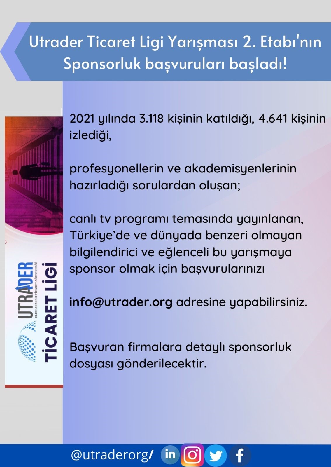 2021 yılı Eylül – Aralık aylarında gerçekleşen Birinci Sezon Yarışmamıza olan ilgi sonrasında ikinci sezon için de devam etme kararı vermiştik. Bu sezon için sponsor olmak isteyen firmalara başvurularımız açıldı. Siz de yüzlerce kişinin yarıştığı ve sahasının profesyonelleri ve yöneticilerinin de katıldığı bu yarışmada isminizi duyurmak ve Dış Ticaret Sahasına özel bir tanıtım çalışması yapmak isterseniz, hemen başvurabilirsiniz. Detaylı sponsorluk dosyası ayrıca gönderilecektir. Sponsorluk dosyasını istemek için info@utrader.org adresine mail göndermeniz yeterlidir.